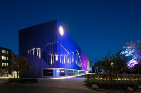 RGB LED Ausleuchtung der Weltkugel auf dem Hotel